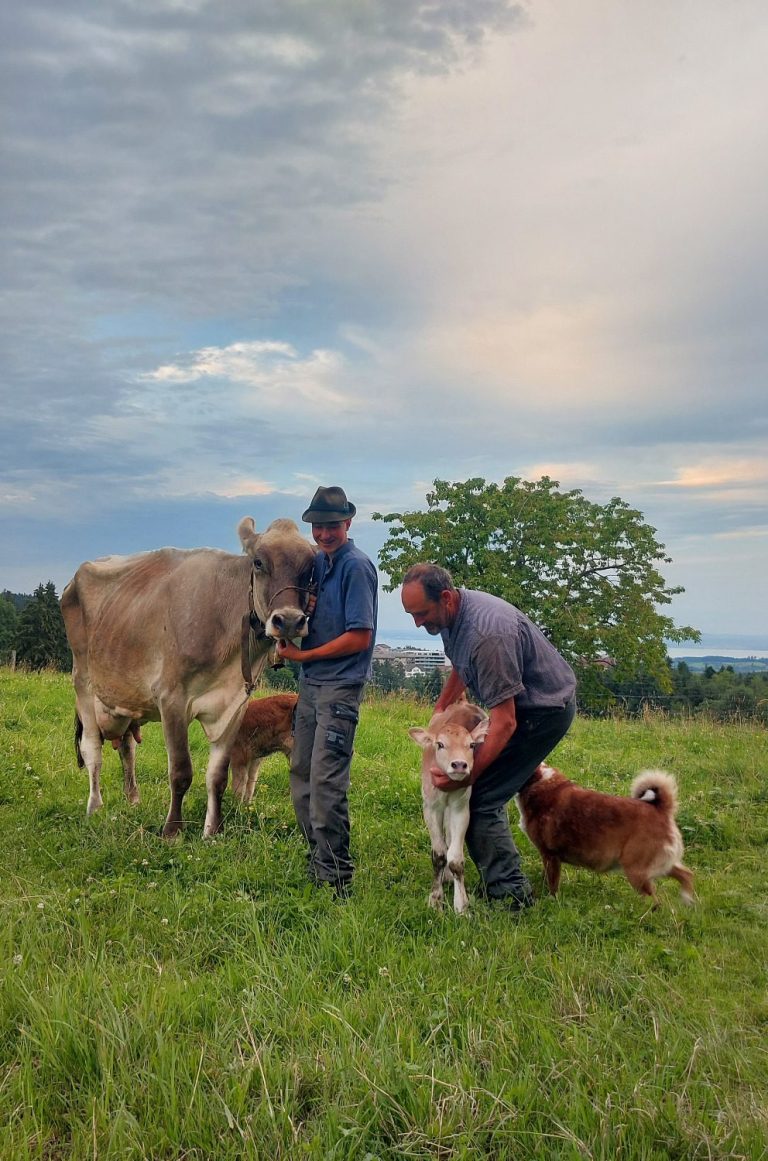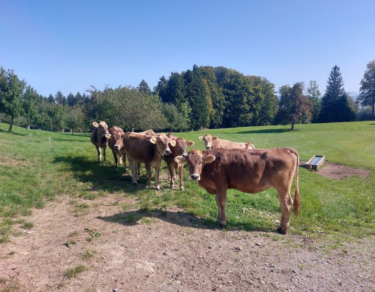Wir bewirtschaften unseren Hof selbst. Unsere Milchkühe und Rinder sind oft auf der Weide, was im Sommer einen grossen Bestandteil der Fütterung ausmacht. Ansonsten füttern wir Heu und Silo von unseren Wiesen rund um den Hof.